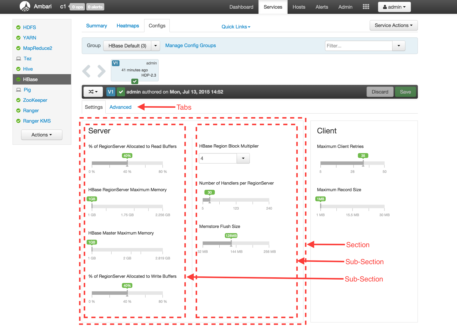 Introduced in Ambari-2.1.0, the Enhanced Configs feature makes it possible for service providers to customize their service's configs to a great deal and determine which configs are prominently shown to user without making any UI code changes. Customization includes providing a service friendly layout, better controls (sliders, combos, lists, toggles, spinners, etc.), better validation (minimum, maximum, enums), automatic unit conversion (MB, GB, seconds, milliseconds, etc.), configuration dependencies and improved dynamic recommendations of default values.