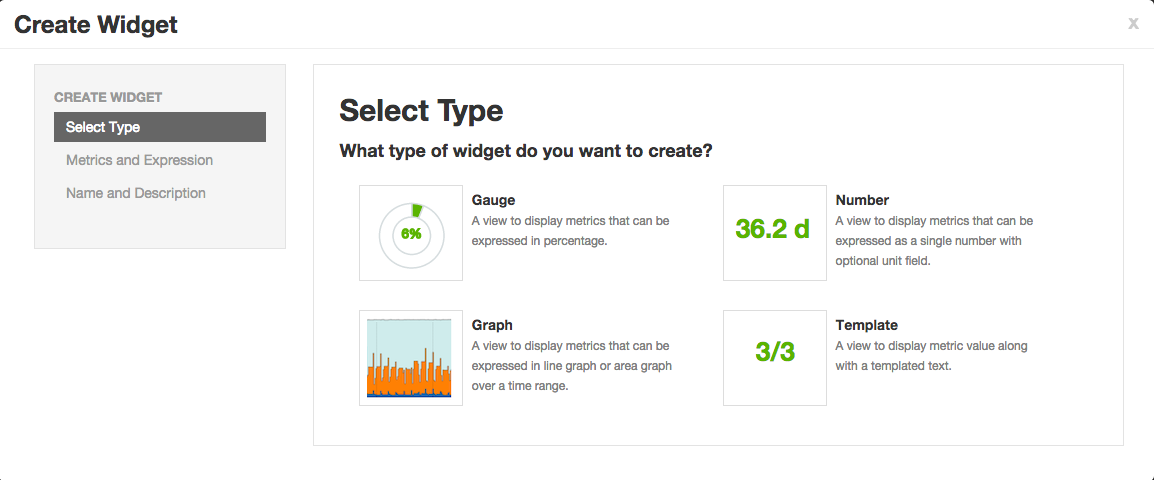 A custom desired widget can be created from the exposed service metrics using 3 step Create Widget wizard.