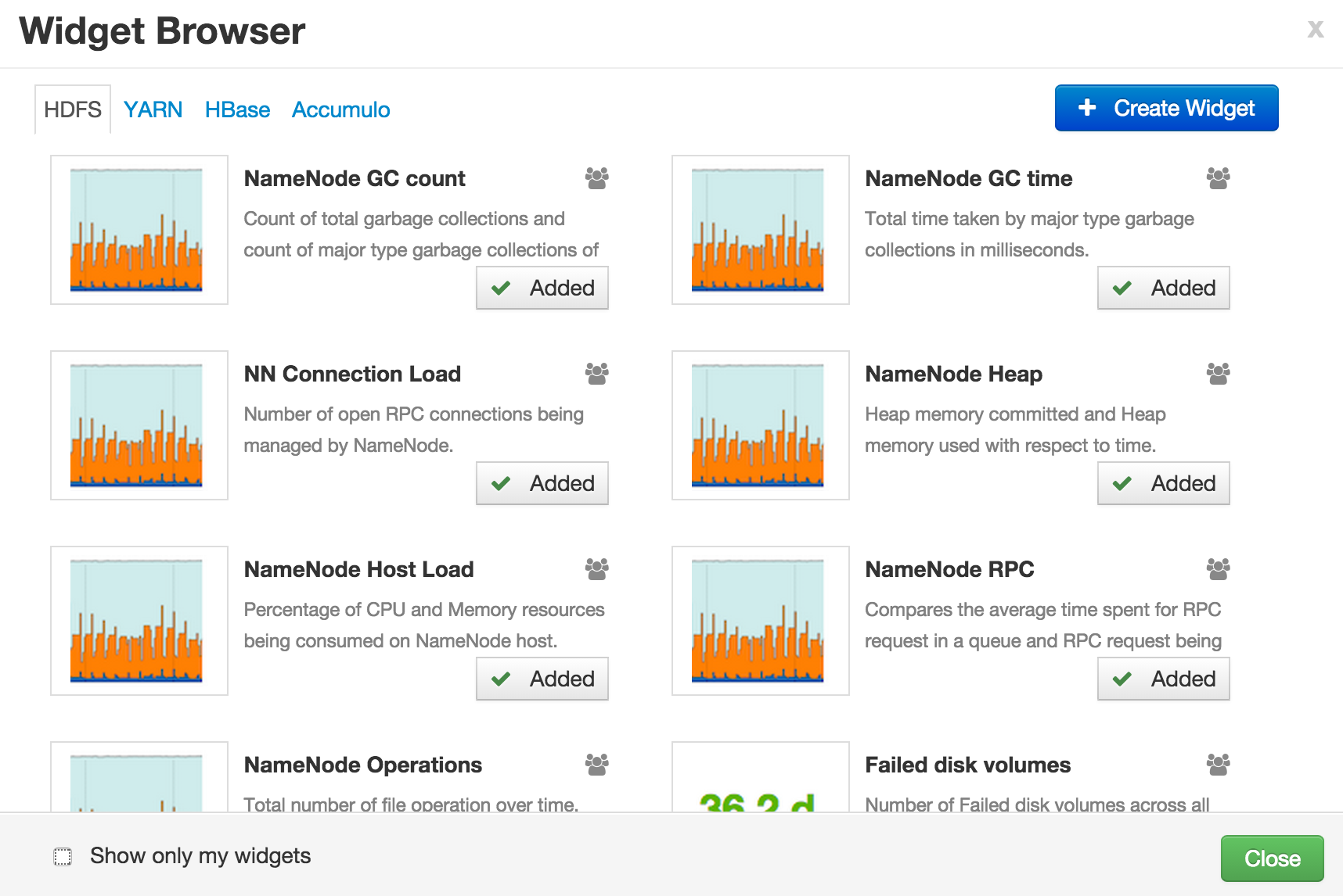 Widget Browser is the place from which actions can be performed on widgets like adding/removing a widget from the dashboard, sharing widget with other users and deleting a widget.While creating new widget, user can choose to share the widget with other users or not. All widgets that are created by the user + shared with the user + defined in the stack as default service widgets will be available in the widget browser of a user.
