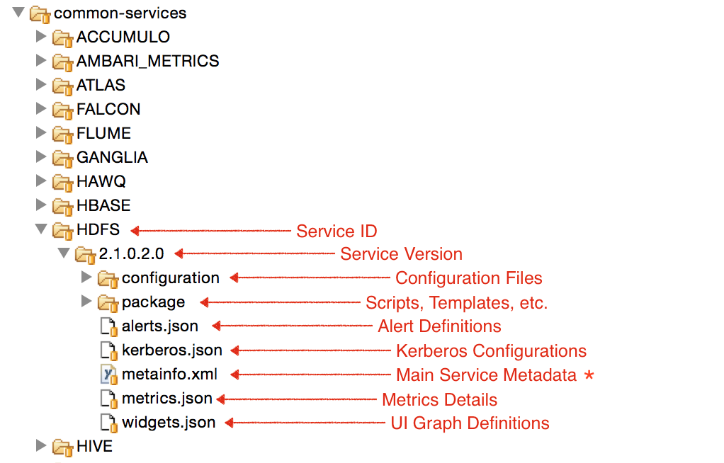 Question: When do I define service in common-services vs. stacks folders? One would define services in the common-servicesfolder if there is possibility of the service being used in multiple stacks. For example, almost all stacks would need the HDFS service - so instead of redefining HDFS in each stack, the one defined in common-services is referenced .Likewise, if a service is never going to be shared, it can be defined in the stacksfolder.Basically services defined in stacks folder are used by containment, whereas the ones defined in common-services are used by reference.