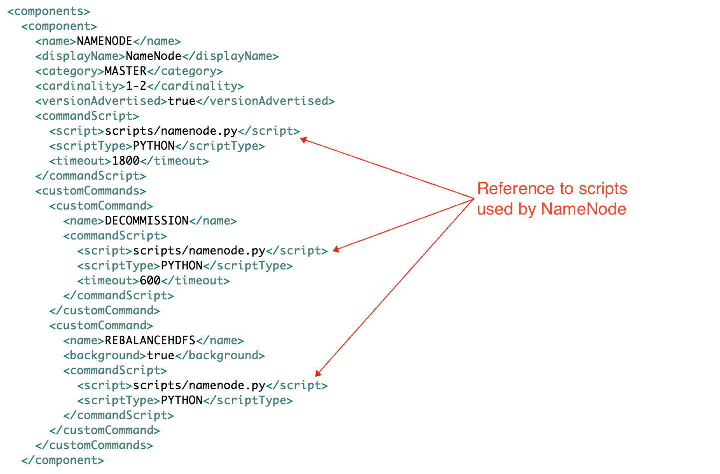 The scripts necessary to manage service and components are specified in the metainfo.xml (HDFS) Each of these scripts should extend the Script class which provides useful methods. Example: NameNode script