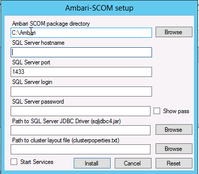 | Ambari SCOM package directory | The directory where the installer will place the Ambari SCOM Server packages. For example: C:\Ambari |