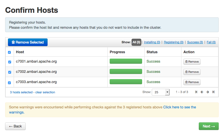 If you see an error similar to the following on the Confirm Hosts page of the Ambari installation wizard, click the link to see the warnings: 'Some warnings were encountered while performing checks against the 3 registered hosts above. Click here to see the warnings."